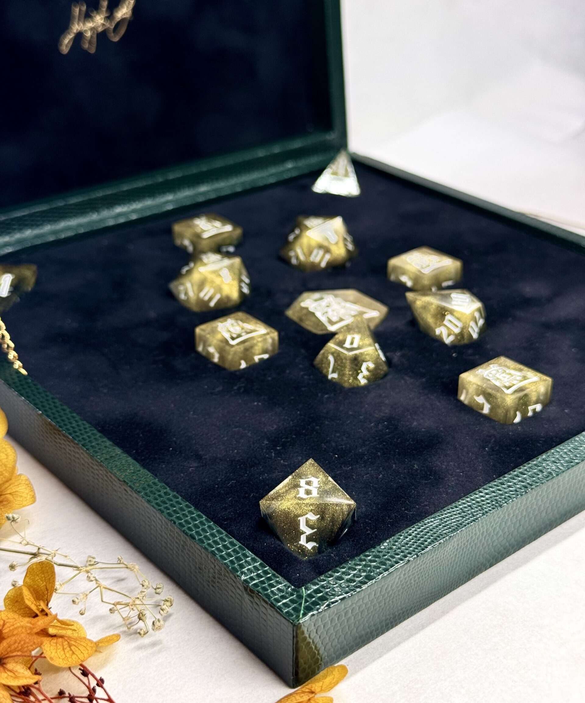 This exquisite 13-piece handcrafted dice set comes housed in a beautifully handmade dice box, designed to highlight the artistry of each individual die. Every piece is carefully crafted by hand, ensuring no two sets are exactly alike. Perfect for collectors, enthusiasts, or as a truly special gift. The box itself not only serves as an elegant display case but also protects and preserves the quality of your dice for years to come.
