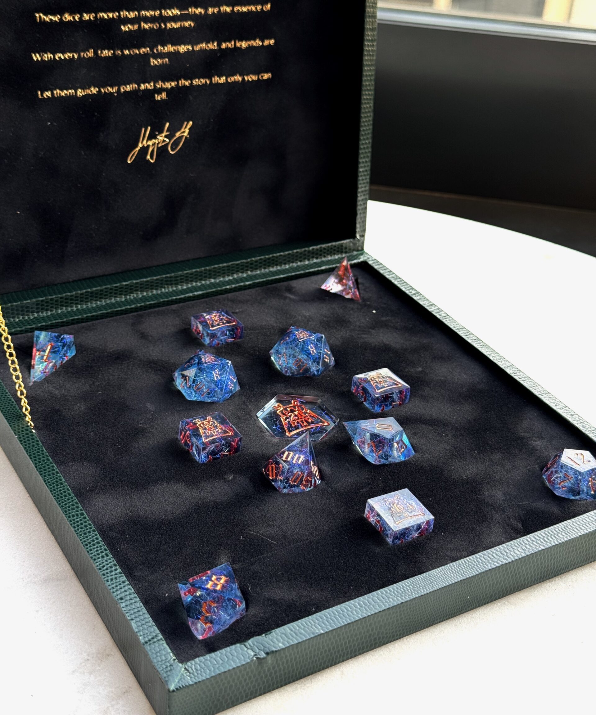 This exquisite 13-piece handcrafted dice set comes housed in a beautifully handmade dice box, designed to highlight the artistry of each individual die. Every piece is carefully crafted by hand, ensuring no two sets are exactly alike. Perfect for collectors, enthusiasts, or as a truly special gift. The box itself not only serves as an elegant display case but also protects and preserves the quality of your dice for years to come.