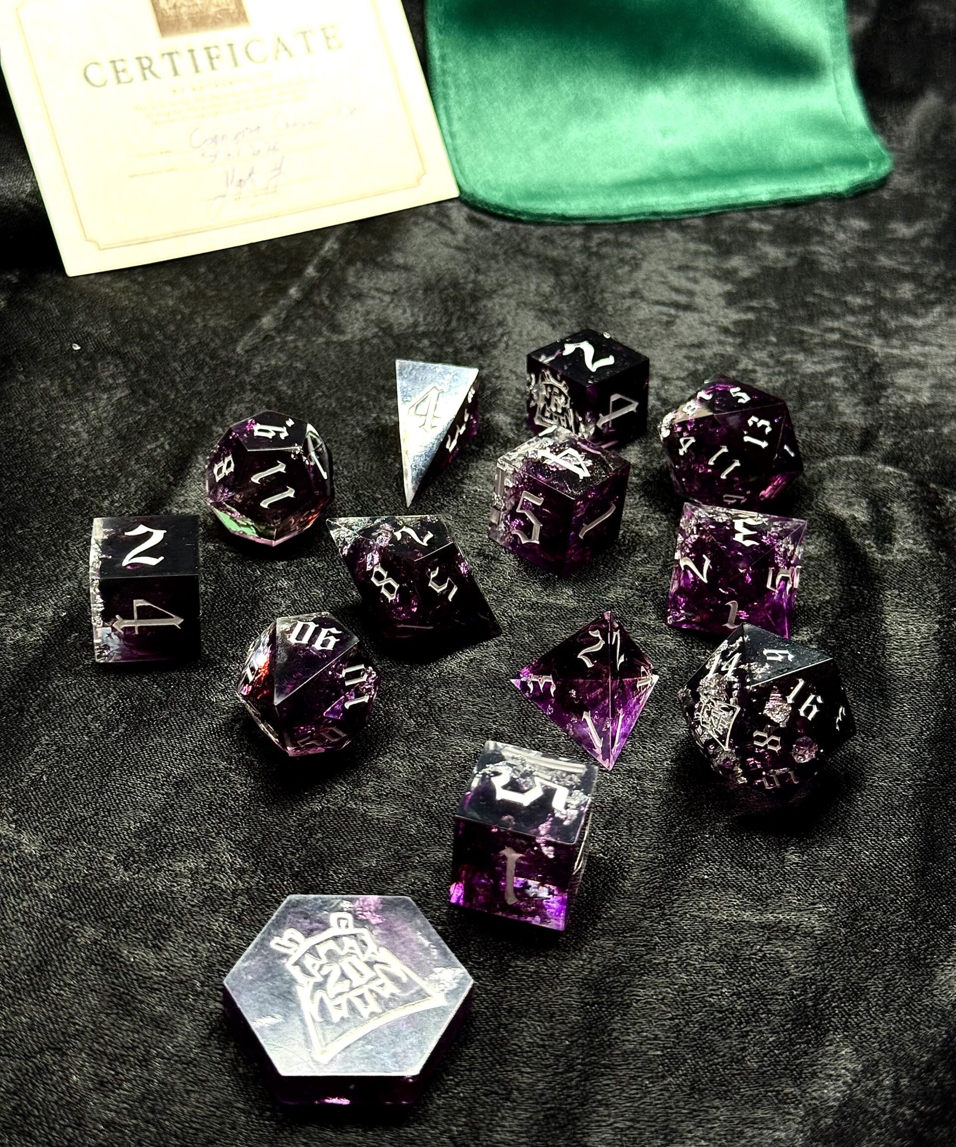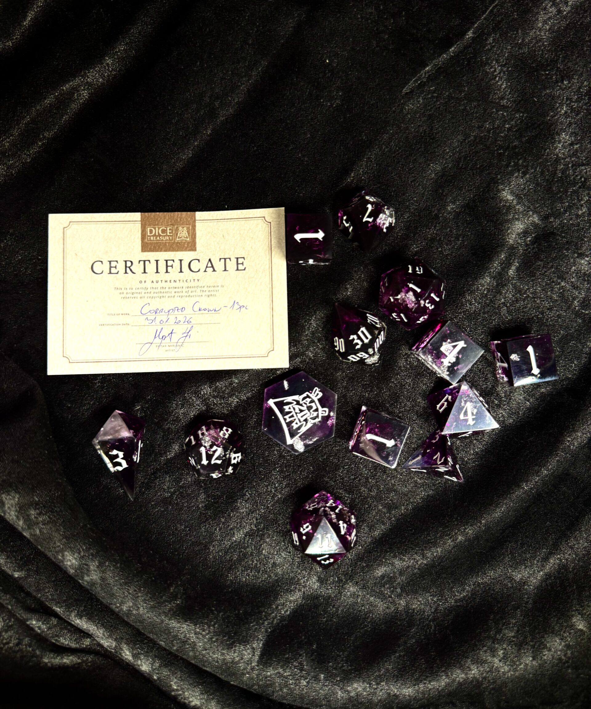 This handcrafted 13-piece dice set is made with careful attention to detail and a unique artistic style. Each set features its own theme and visual character, with colors, inking, and internal elements chosen to create a specific mood and tabletop presence.