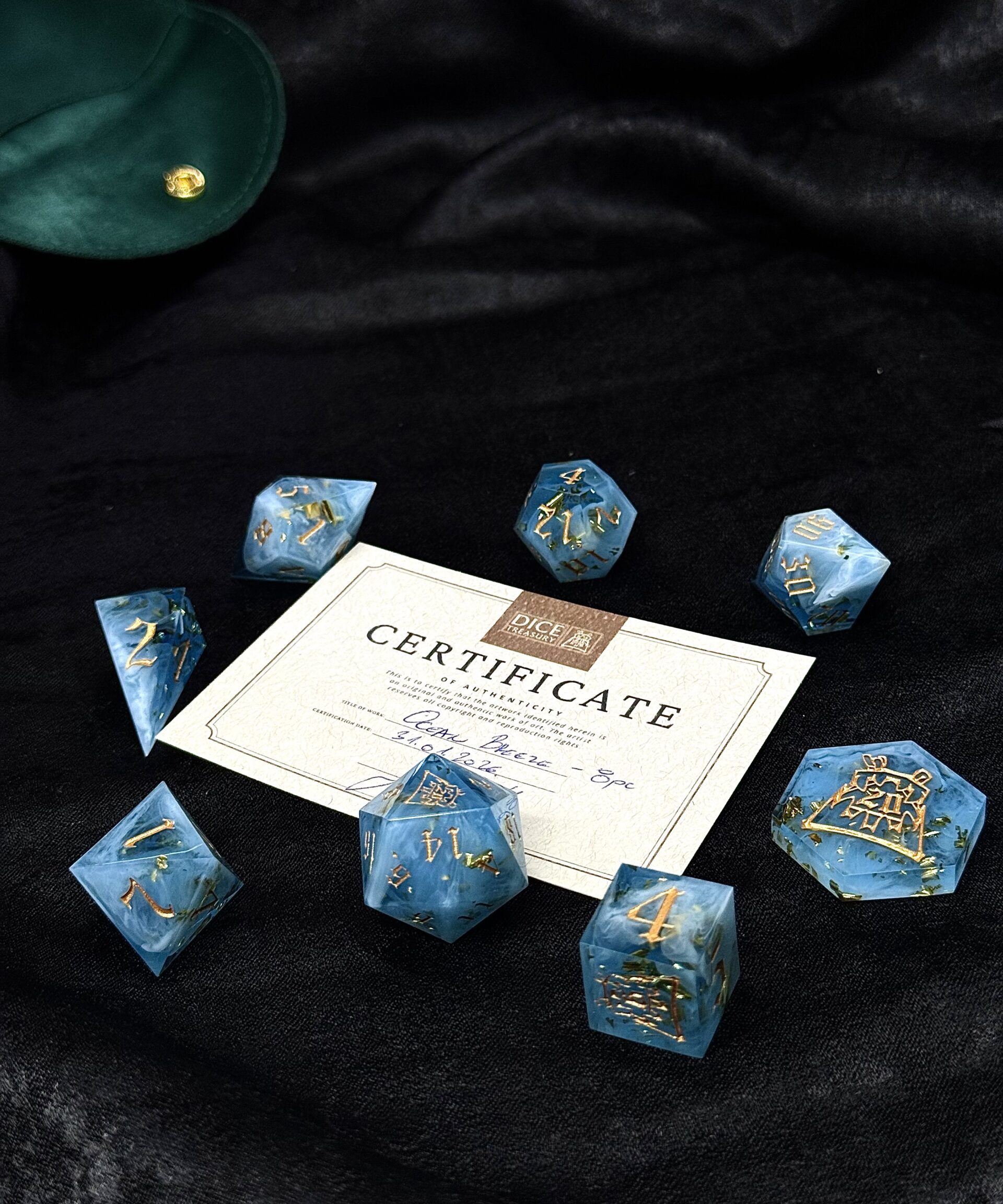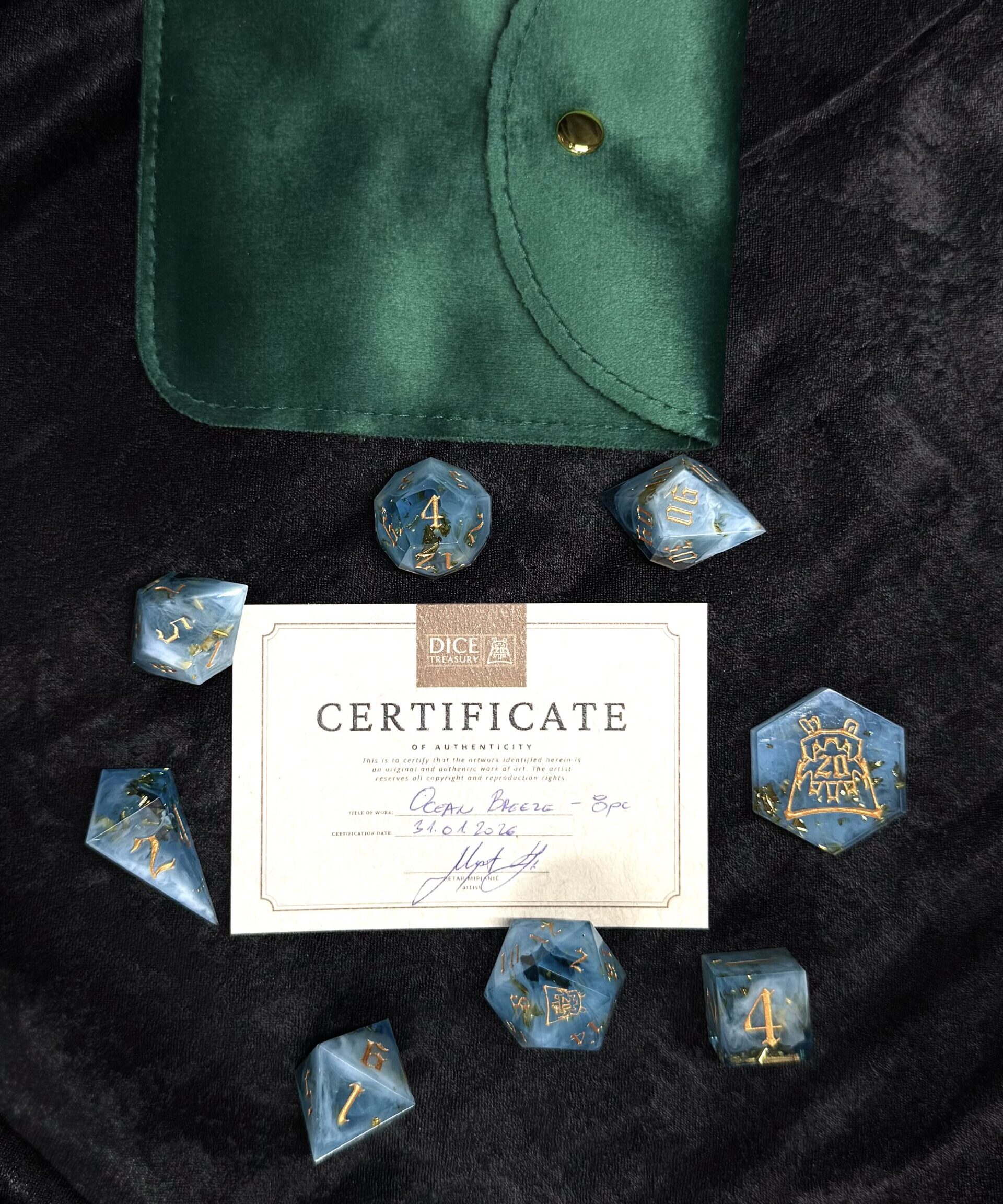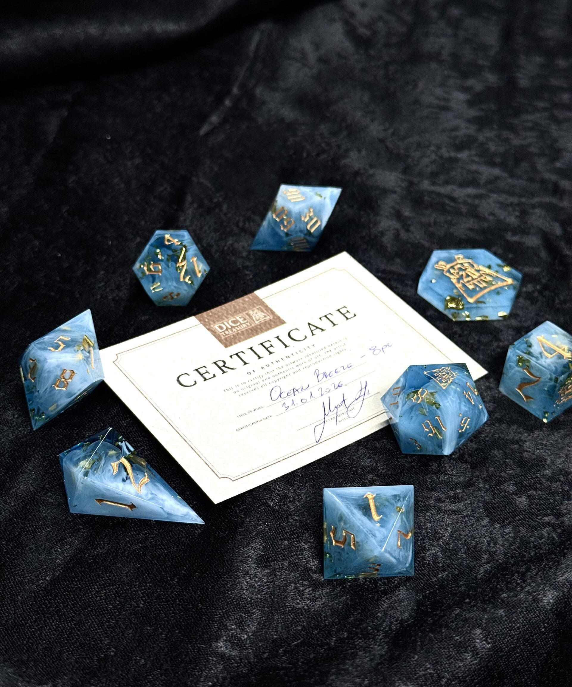 This handcrafted 8-piece dice set is made with careful attention to detail and a unique artistic style. Each set features its own theme and visual character, with colors, inking, and internal elements chosen to create a specific mood and tabletop presence.