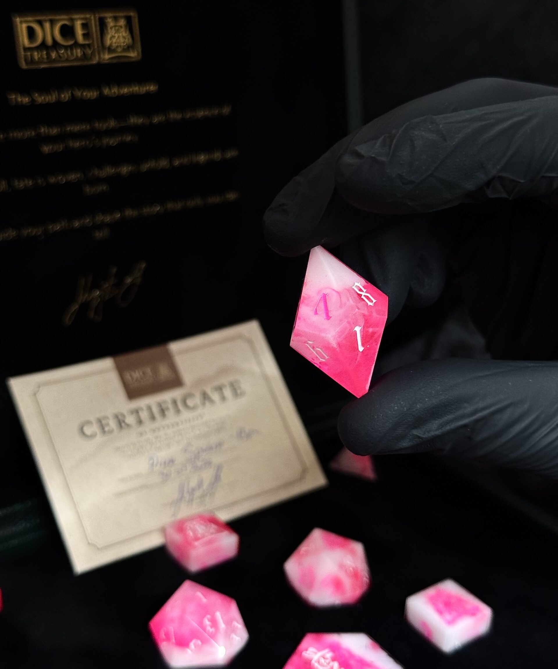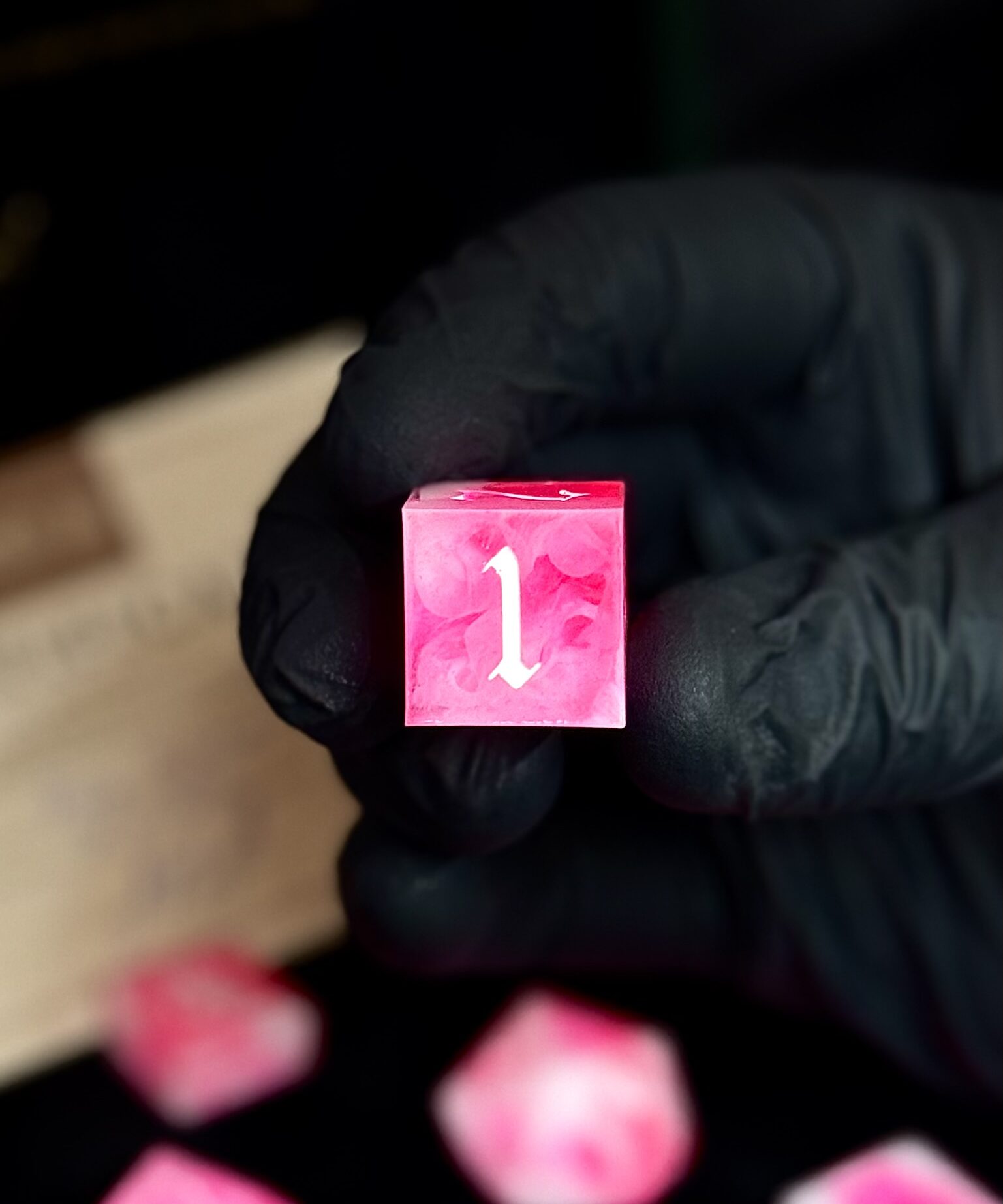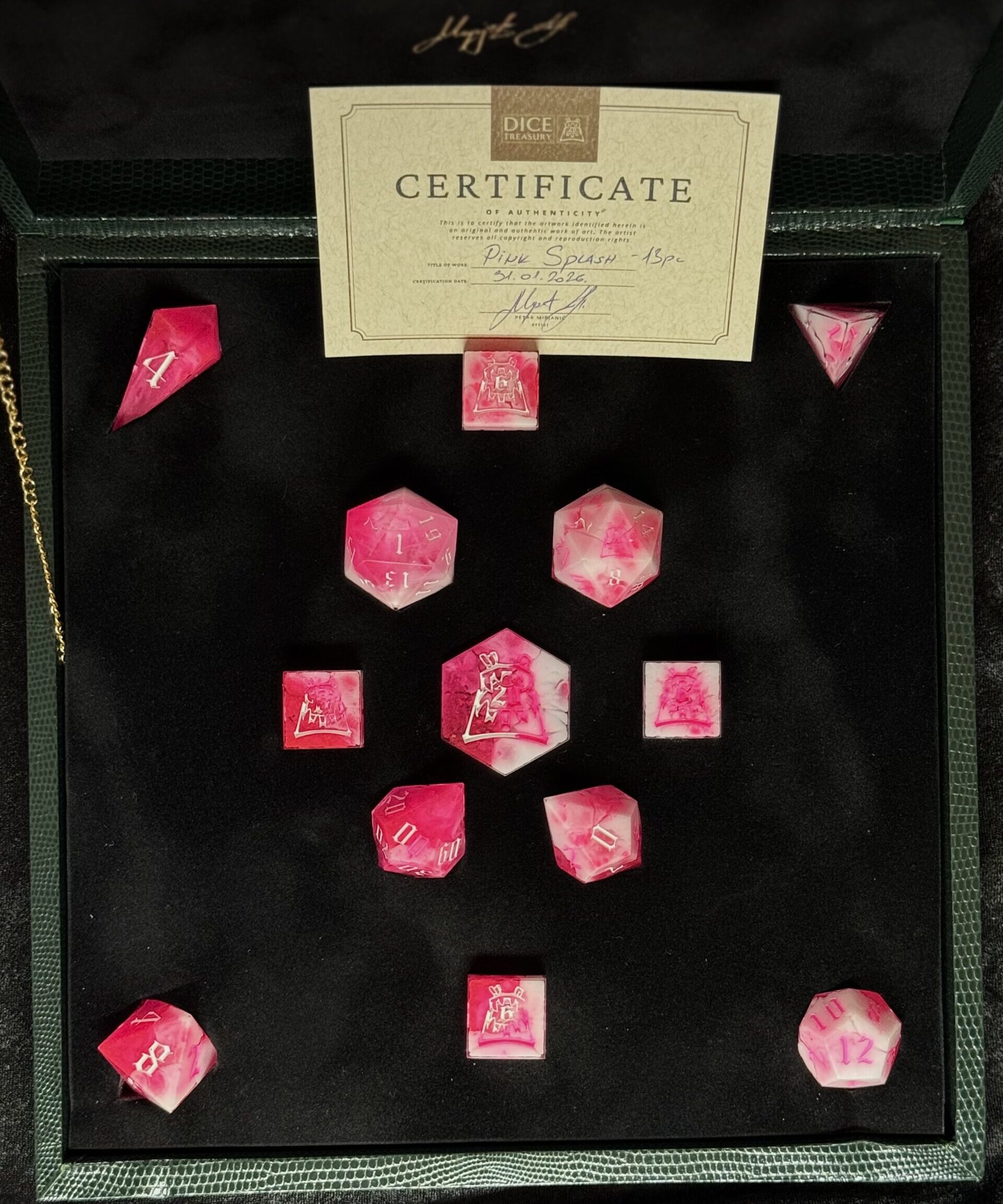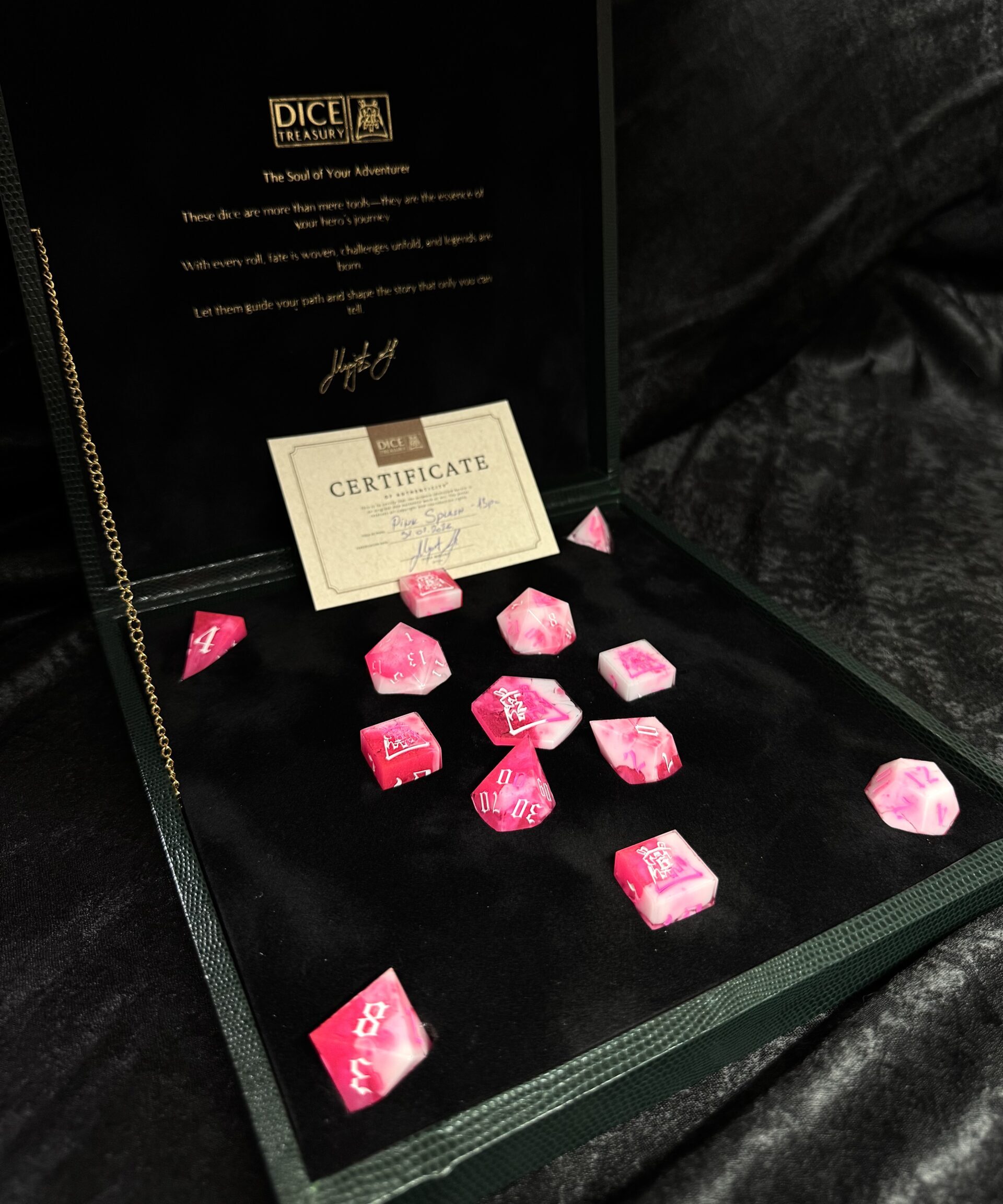 This exquisite 13-piece handcrafted dice set comes housed in a beautifully handmade dice box, designed to highlight the artistry of each individual die. Every piece is carefully crafted by hand, ensuring no two sets are exactly alike. Perfect for collectors, enthusiasts, or as a truly special gift. The box itself not only serves as an elegant display case but also protects and preserves the quality of your dice for years to come.