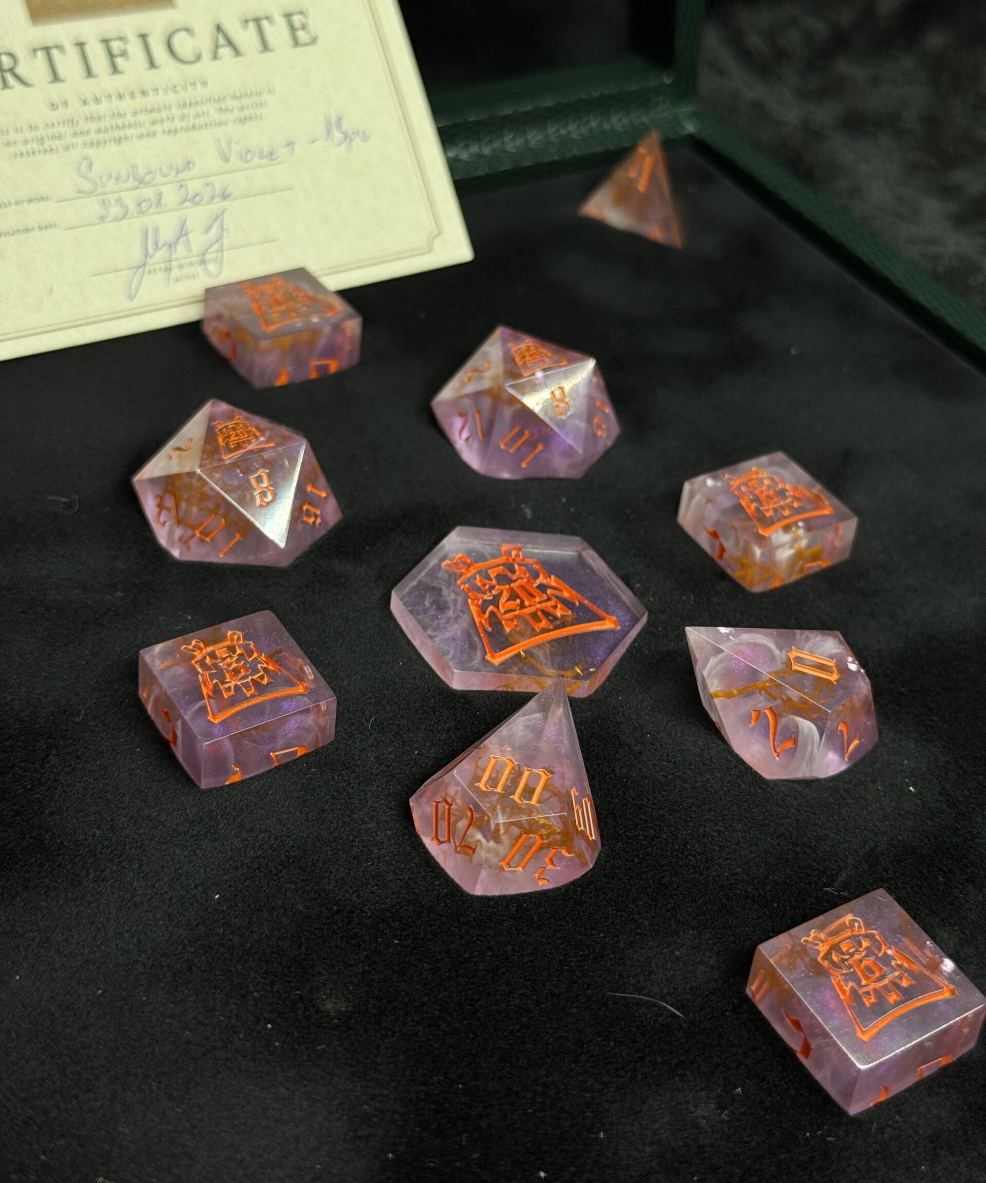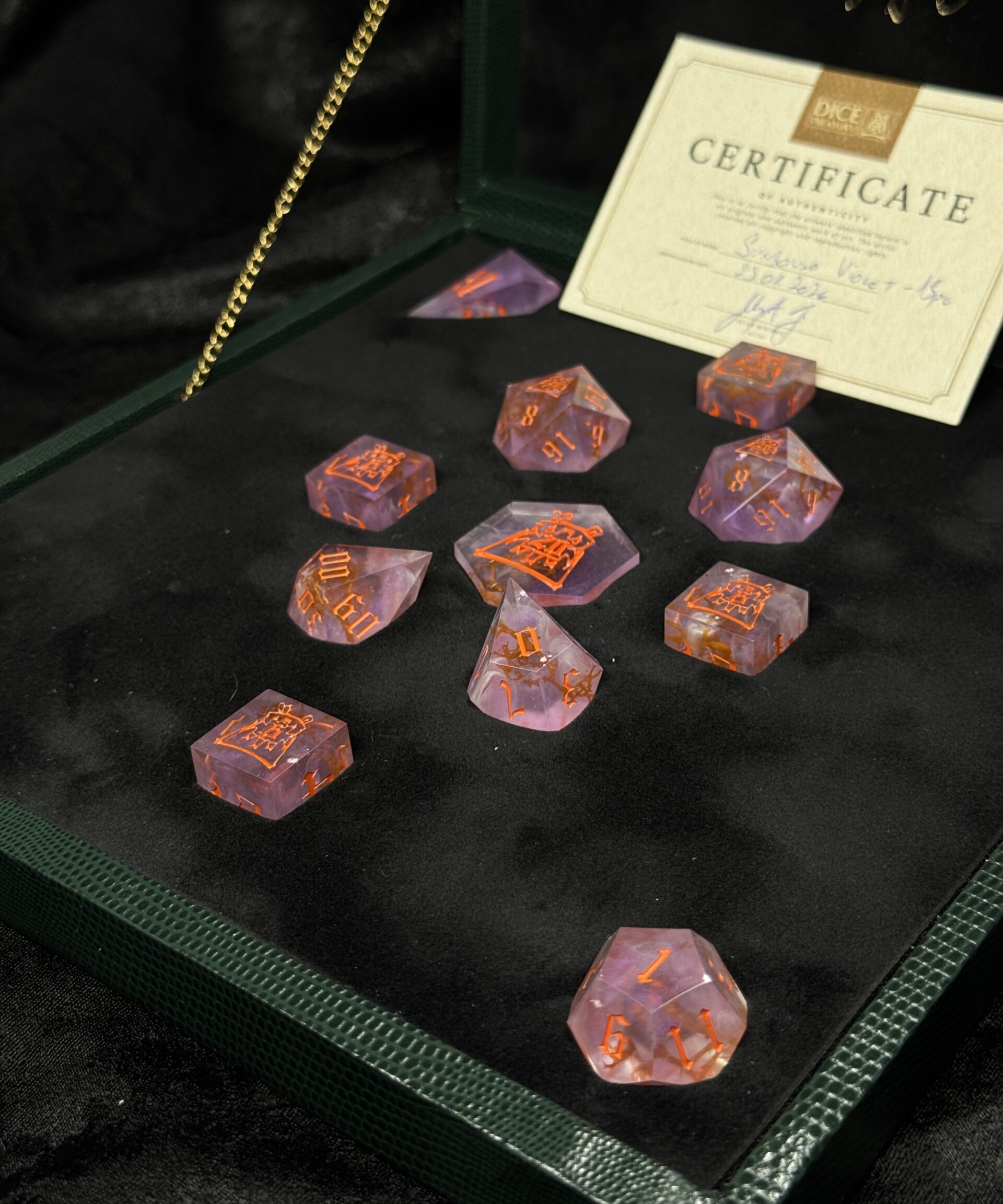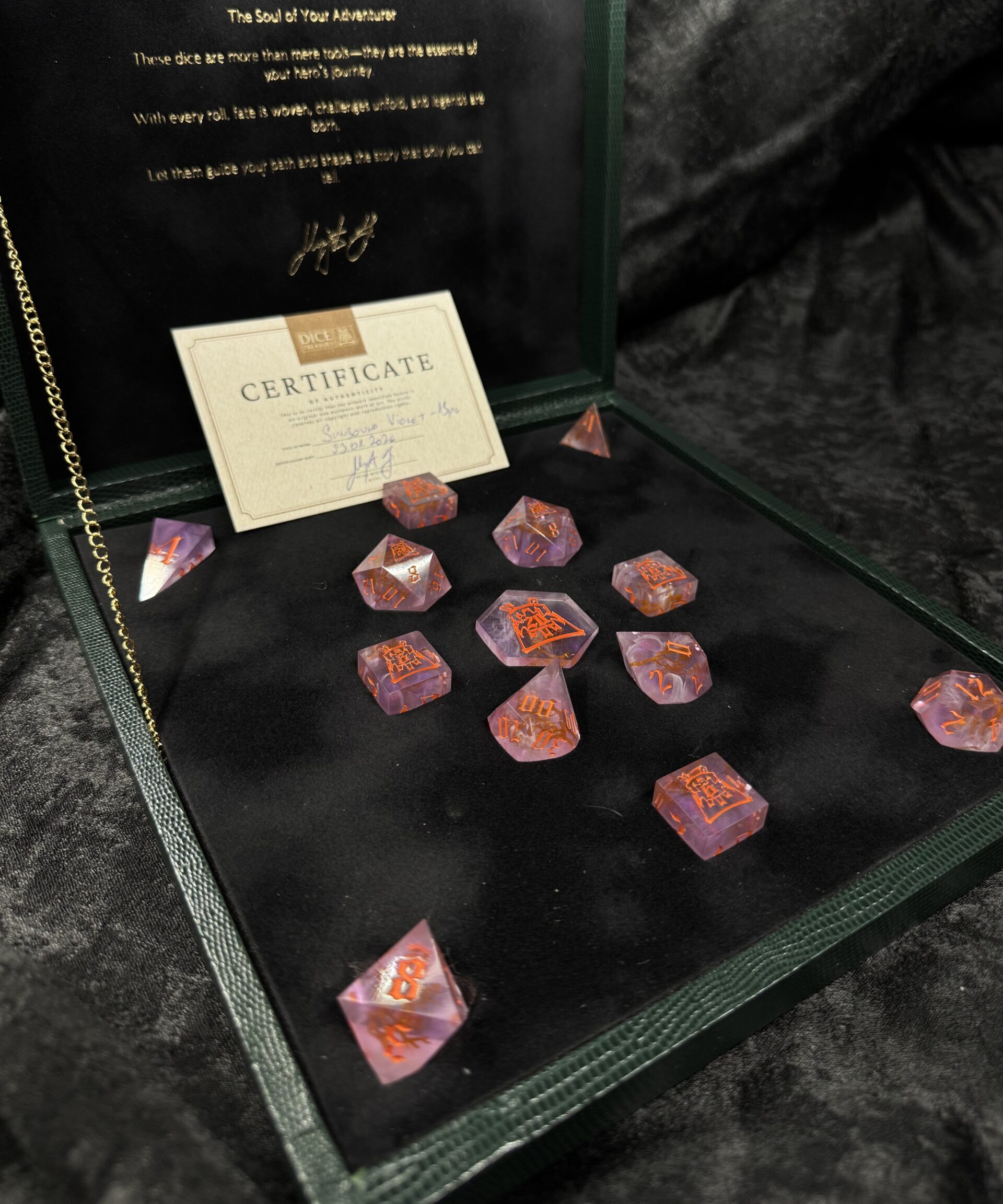 This exquisite 13-piece handcrafted dice set comes housed in a beautifully handmade dice box, designed to highlight the artistry of each individual die. Every piece is carefully crafted by hand, ensuring no two sets are exactly alike. Perfect for collectors, enthusiasts, or as a truly special gift. The box itself not only serves as an elegant display case but also protects and preserves the quality of your dice for years to come.