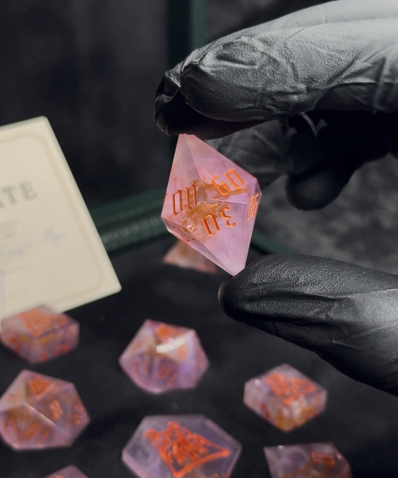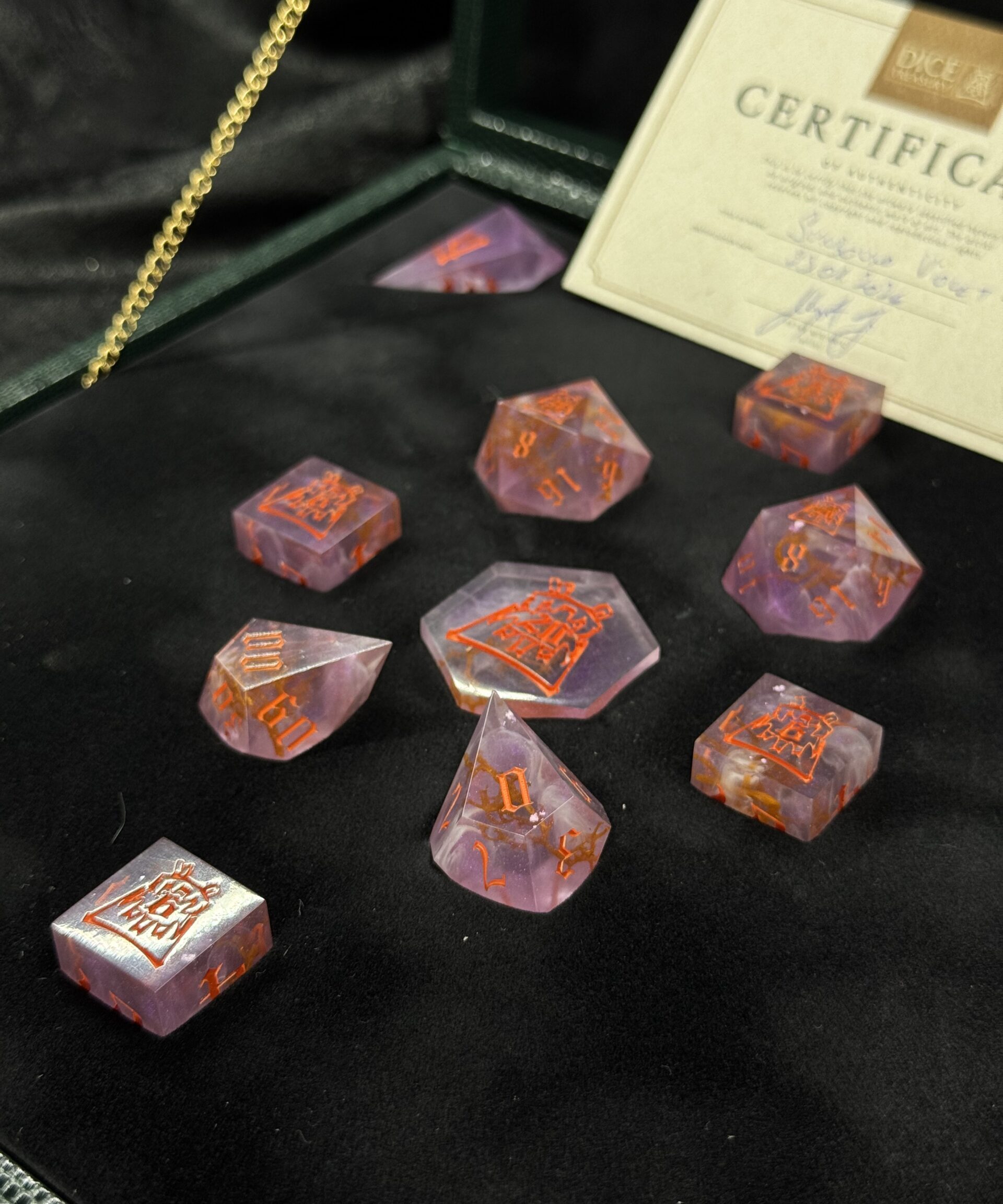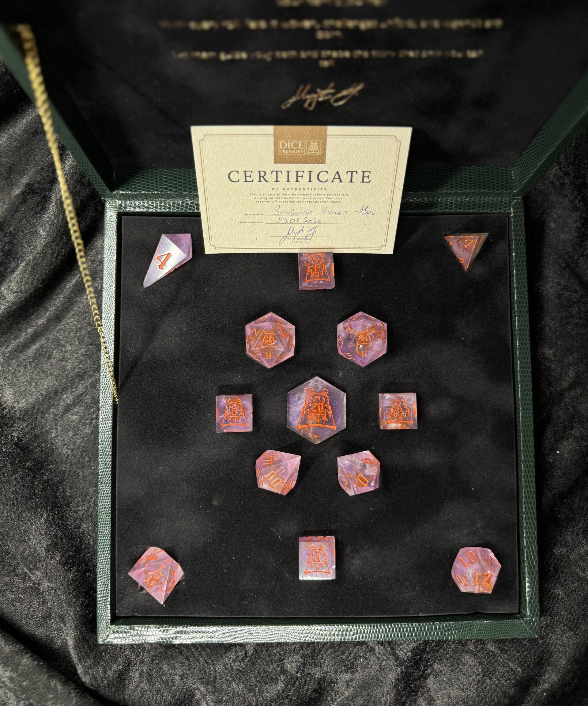 This exquisite 13-piece handcrafted dice set comes housed in a beautifully handmade dice box, designed to highlight the artistry of each individual die. Every piece is carefully crafted by hand, ensuring no two sets are exactly alike. Perfect for collectors, enthusiasts, or as a truly special gift. The box itself not only serves as an elegant display case but also protects and preserves the quality of your dice for years to come.
