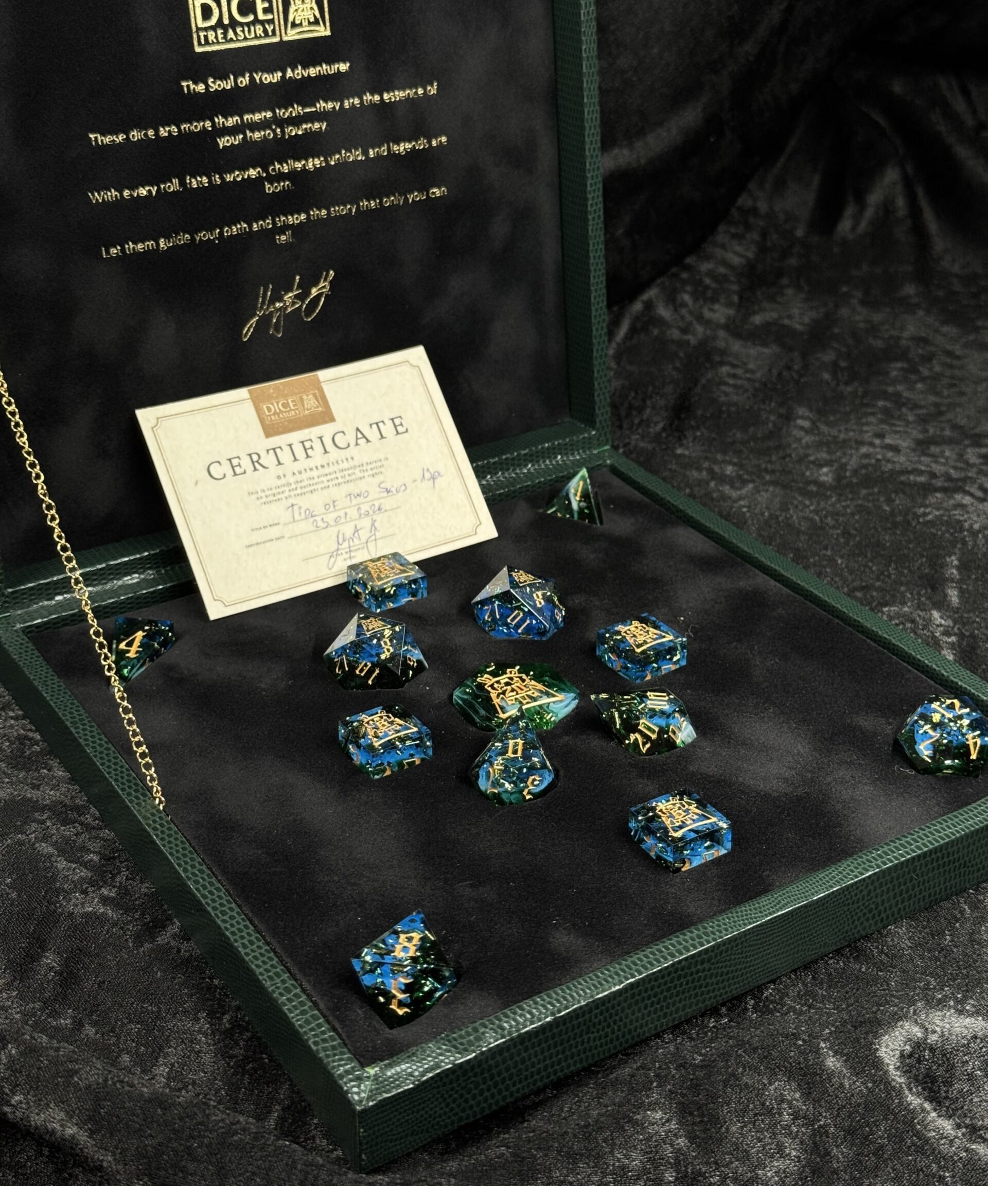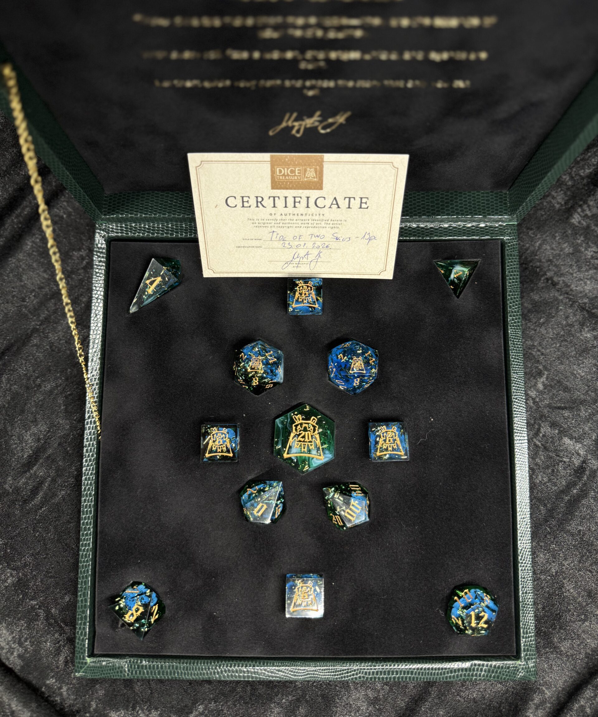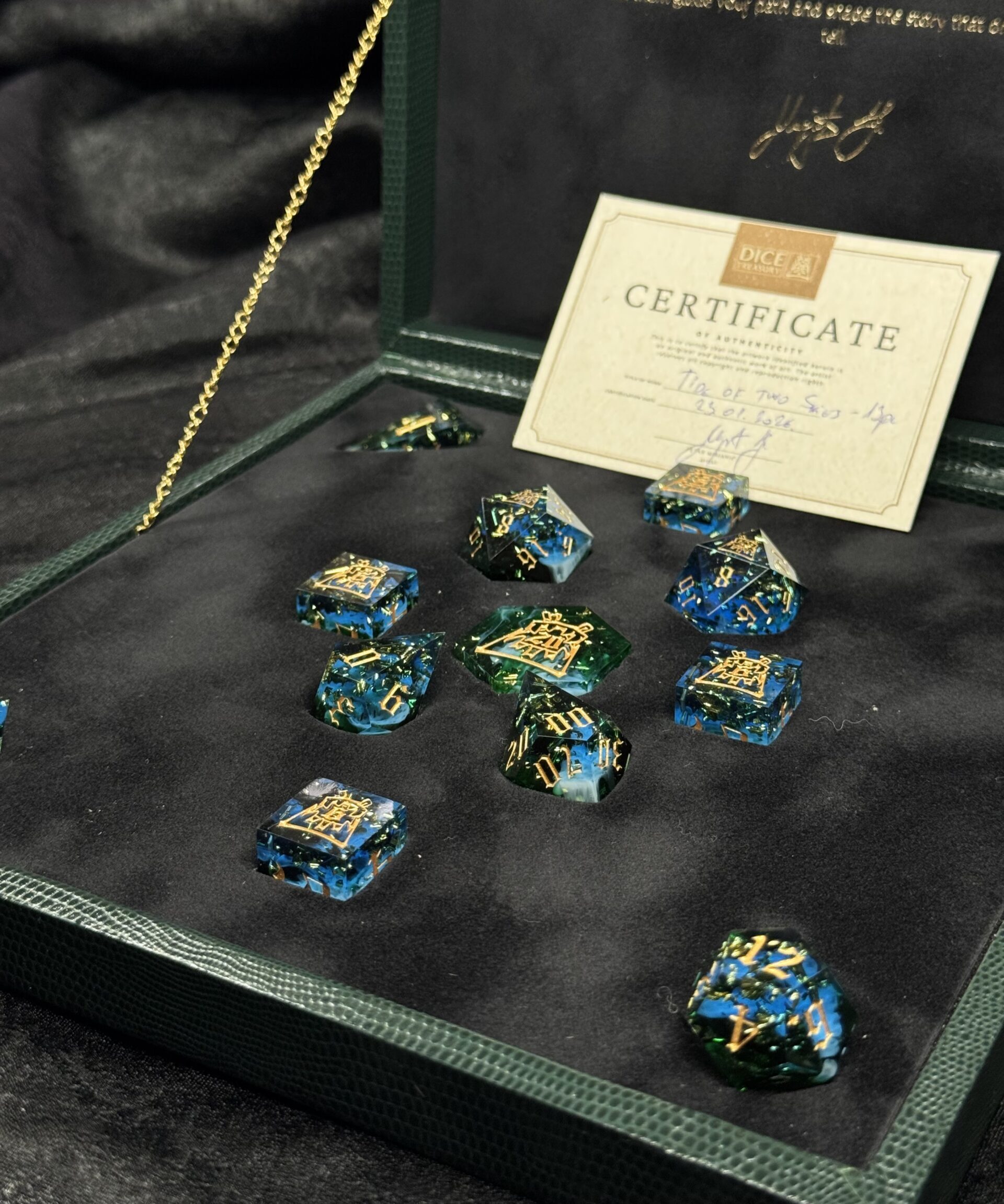 This exquisite 13-piece handcrafted dice set comes housed in a beautifully handmade dice box, designed to highlight the artistry of each individual die. Every piece is carefully crafted by hand, ensuring no two sets are exactly alike. Perfect for collectors, enthusiasts, or as a truly special gift. The box itself not only serves as an elegant display case but also protects and preserves the quality of your dice for years to come.