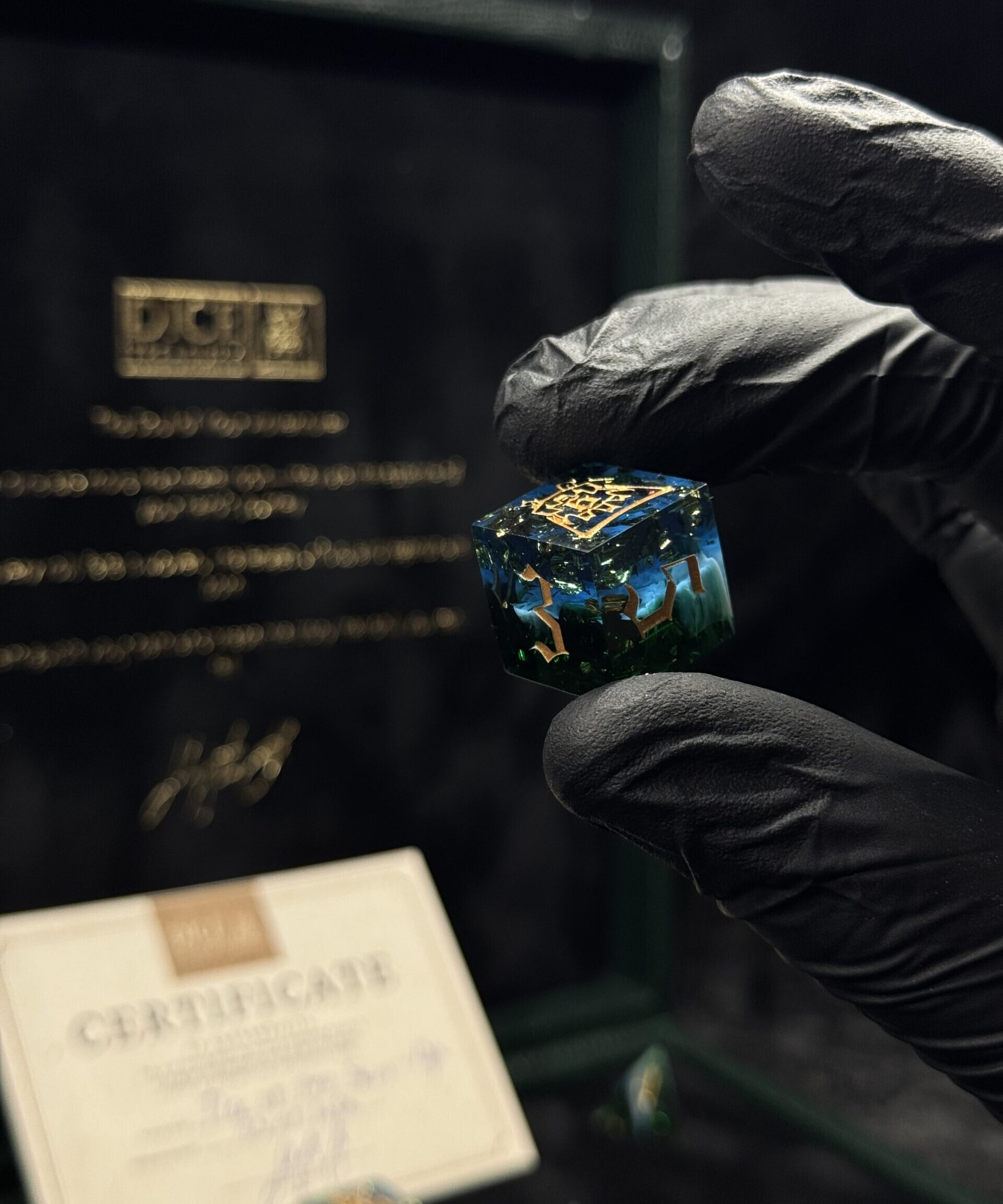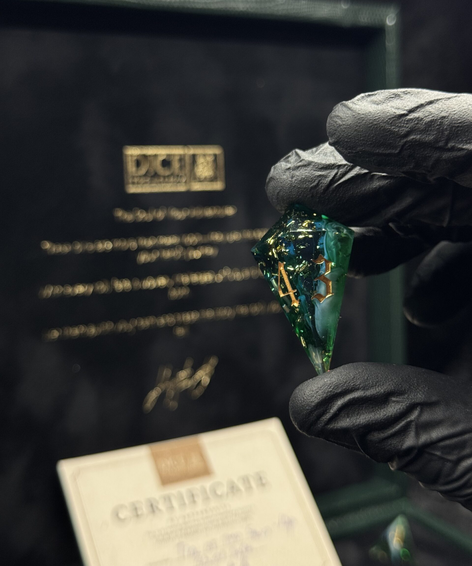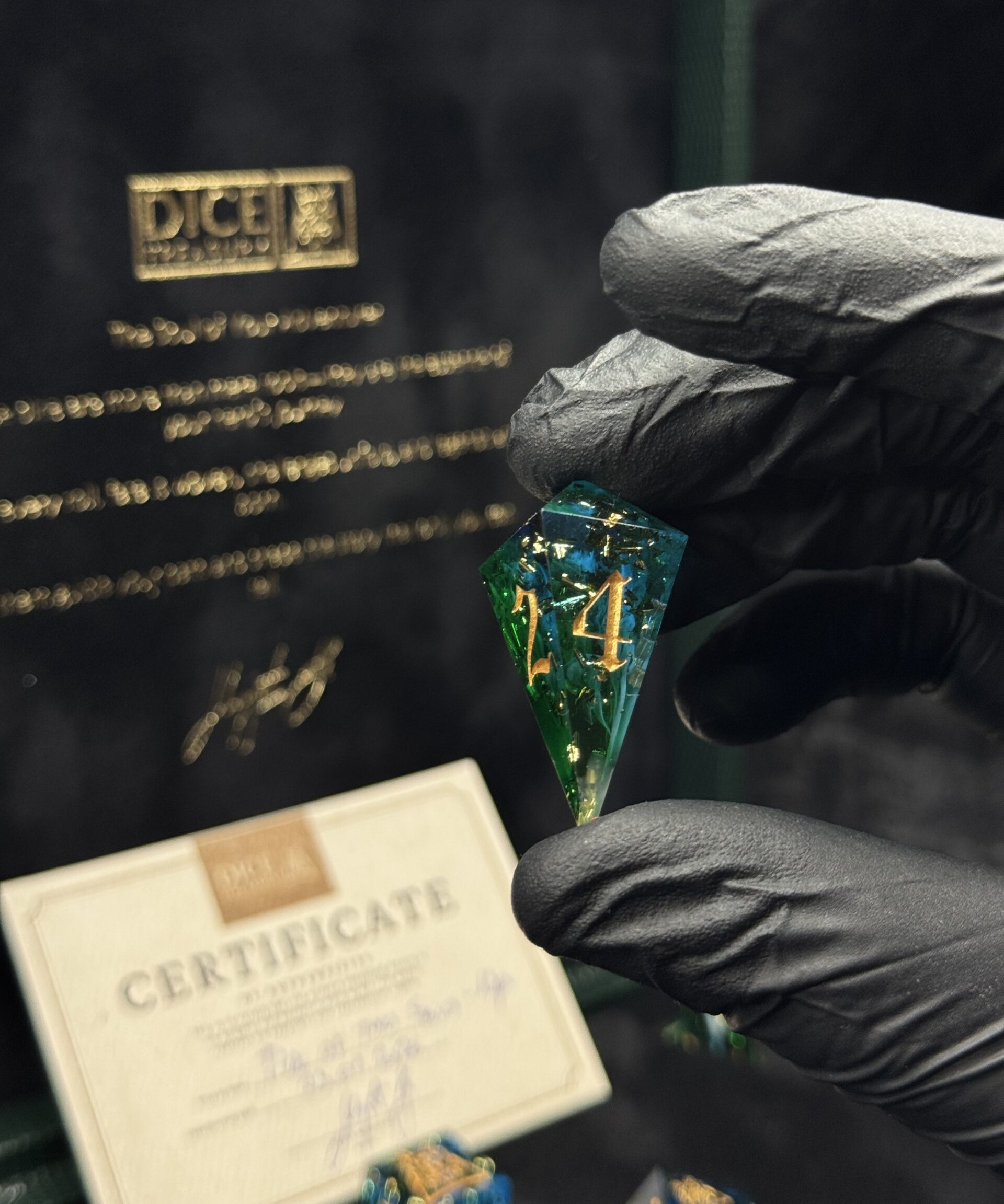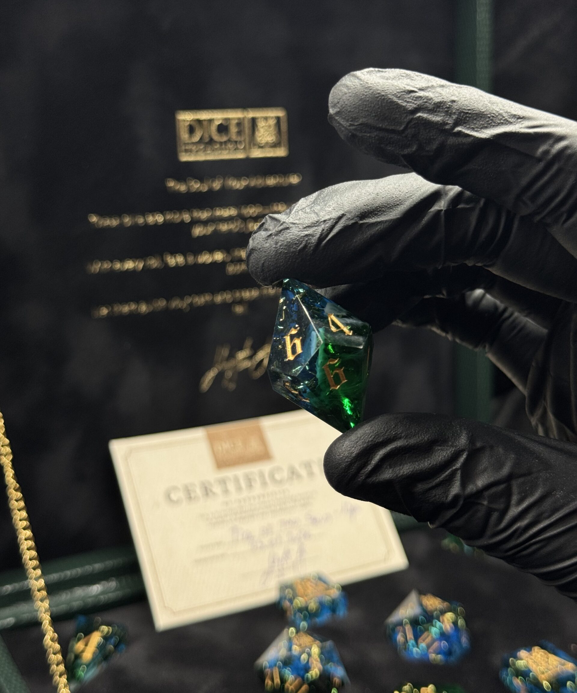 This exquisite 13-piece handcrafted dice set comes housed in a beautifully handmade dice box, designed to highlight the artistry of each individual die. Every piece is carefully crafted by hand, ensuring no two sets are exactly alike. Perfect for collectors, enthusiasts, or as a truly special gift. The box itself not only serves as an elegant display case but also protects and preserves the quality of your dice for years to come.