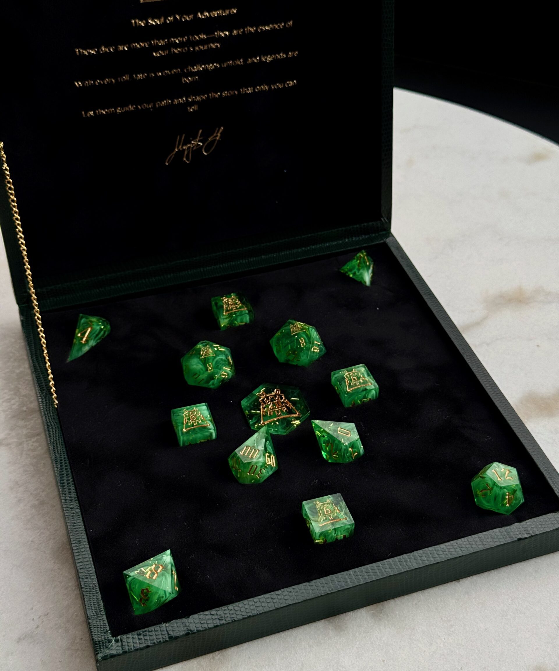 This exquisite 13-piece handcrafted dice set comes housed in a beautifully handmade dice box, designed to highlight the artistry of each individual die. Every piece is carefully crafted by hand, ensuring no two sets are exactly alike. Perfect for collectors, enthusiasts, or as a truly special gift. The box itself not only serves as an elegant display case but also protects and preserves the quality of your dice for years to come.