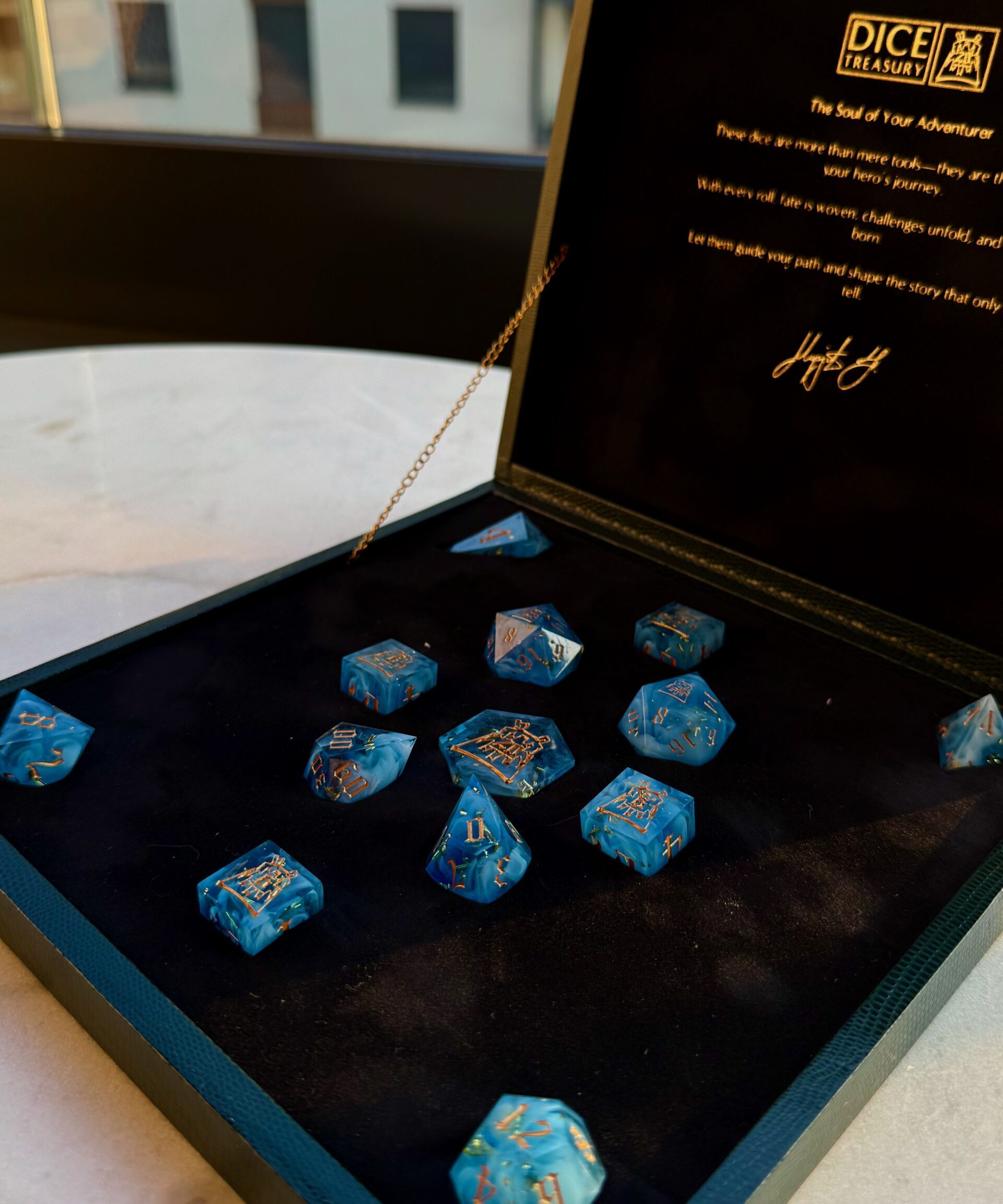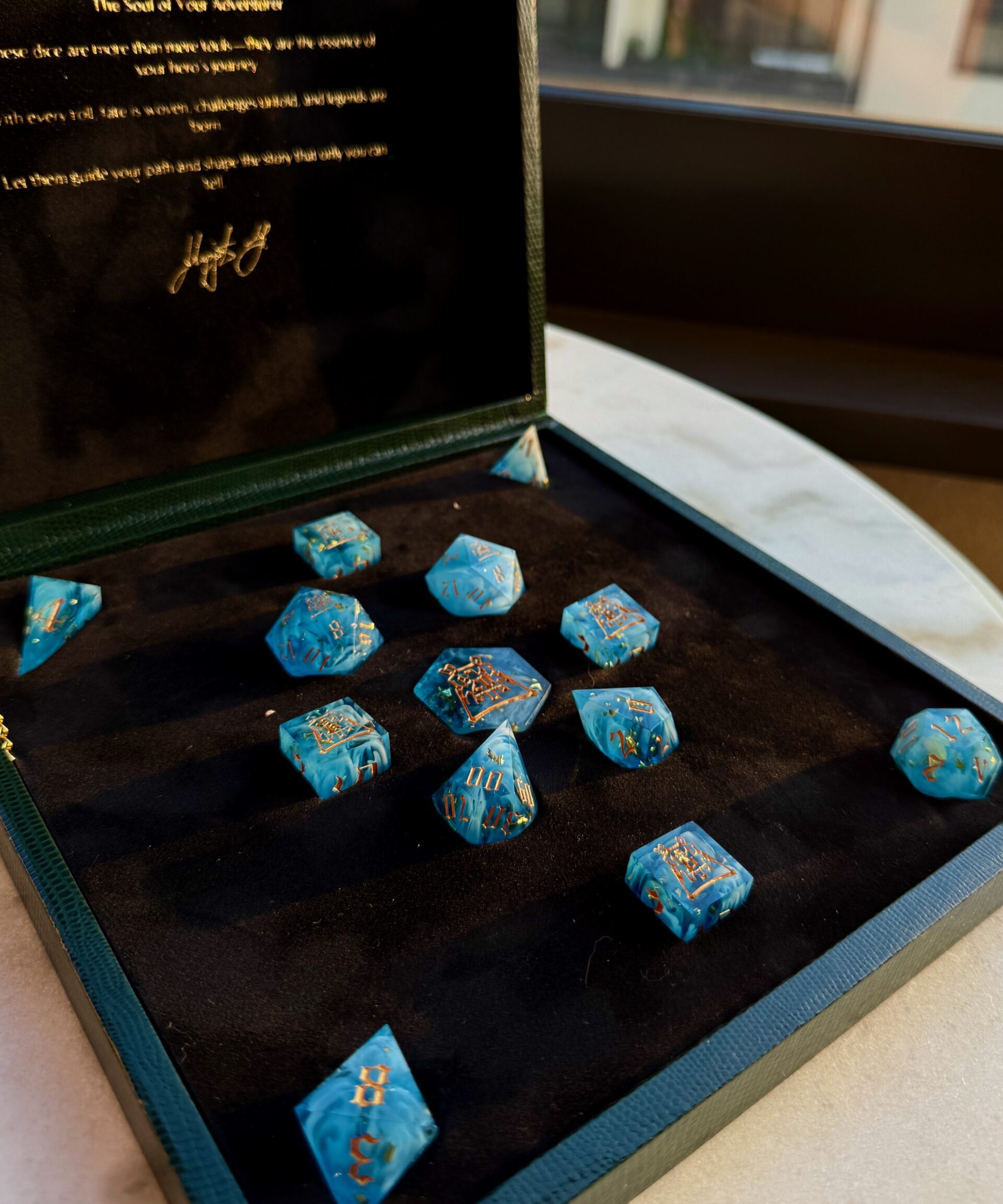 This exquisite 13-piece handcrafted dice set comes housed in a beautifully handmade dice box, designed to highlight the artistry of each individual die. Every piece is carefully crafted by hand, ensuring no two sets are exactly alike. Perfect for collectors, enthusiasts, or as a truly special gift. The box itself not only serves as an elegant display case but also protects and preserves the quality of your dice for years to come.