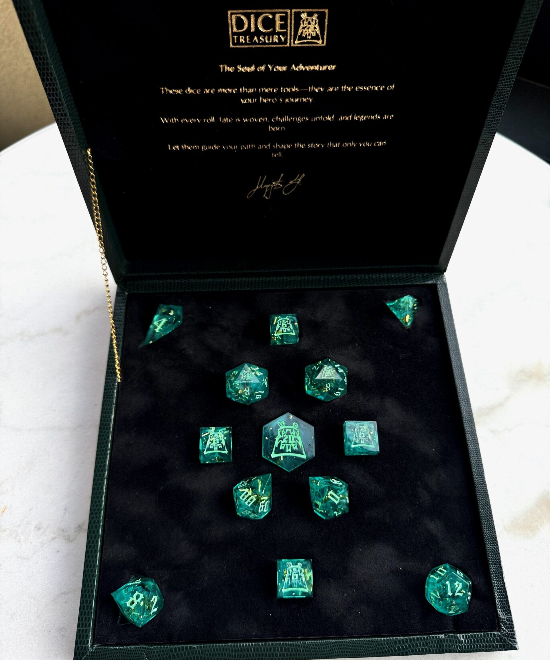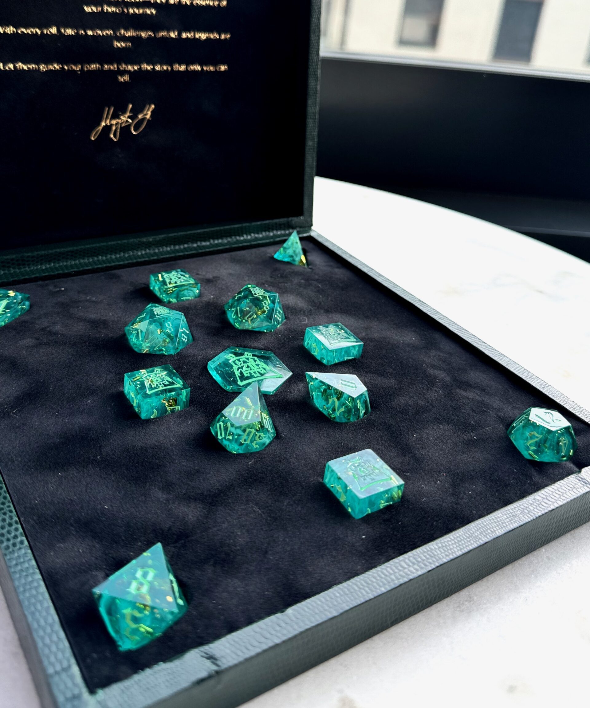 This exquisite 13-piece handcrafted dice set comes housed in a beautifully handmade dice box, designed to highlight the artistry of each individual die. Every piece is carefully crafted by hand, ensuring no two sets are exactly alike. Perfect for collectors, enthusiasts, or as a truly special gift. The box itself not only serves as an elegant display case but also protects and preserves the quality of your dice for years to come.