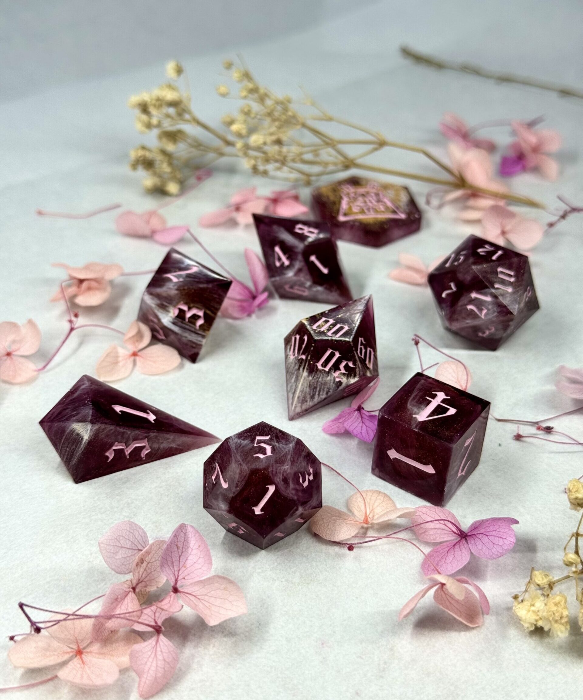 This handcrafted 8-piece dice set is made with careful attention to detail and a unique artistic style. Each set features its own theme and visual character, with colors, inking, and internal elements chosen to create a specific mood and tabletop presence.