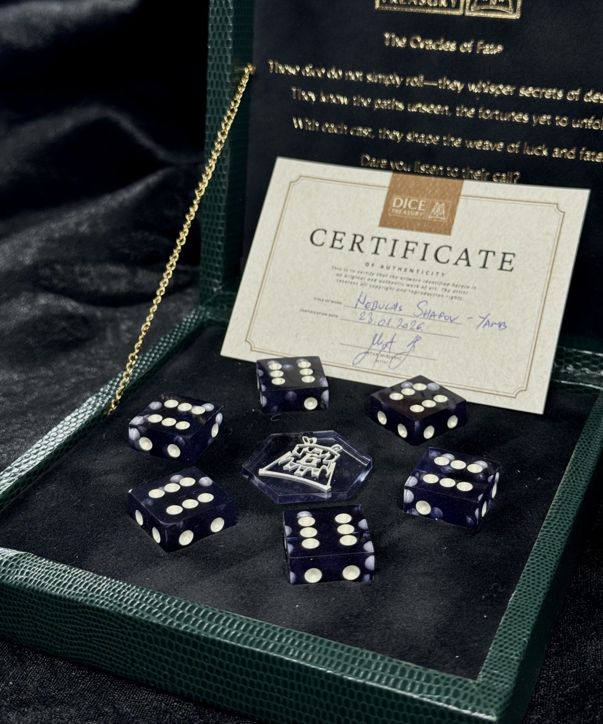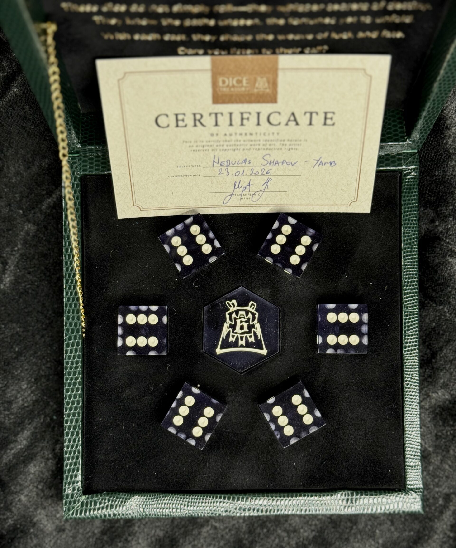 To complete the experience, a signed certificate of authenticity is included, certifying the handmade nature and originality of your unique Yamb set.